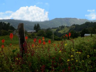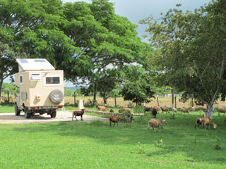 Der Folgetag bringt jedoch die große Überraschung. Zu einem steinernen Wasserfall soll es gehen. Ja ja, wir folgen dem Schild und landen mal wieder auf einer üblen Piste, die uns 10 km über einen Bergkamm führt. Ich ziehe die Luft ein, wenn der Berg rechts neben mir steil in die Tiefe stürzt. Wir kriechen vorwärts, um kurz vor dem heutigen Ziel so richtig auf die Probe gestellt zu werden. Tiefe Furchen, die der Regen durch die Straßen gespült hat und ein höllisch steiles Stück über aufgerissener Fahrbahn werden jedoch von Klaus souverän gemeistert. Dann liegen sie vor uns, zwei steinerne Wasserfälle mit natürlichen kalkhaltigen Pools, in denen man wunderbar baden kann. Unser Lager schlagen wir mit Panoramablick auf Pools und Wasserfall auf - und obendrein noch mit fantastischem Ausblick auf die Bergwelt. Ach - schon wieder stehen wir so schön.