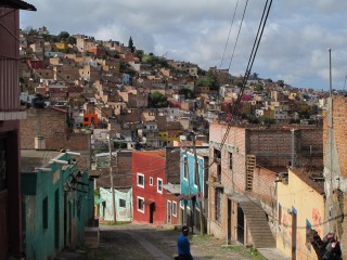 Guanajuato erreichen wir bei Regen und verhangenem Himmel. Wir finden einen Campingplatz mit herrlichem Ausblick auf die an den Berghängen eingezwängte Stadt mit den vielen bunten Häuserfassaden. Die Stadt besticht durch die vielen engen Gassen, der Straßenverkehr wird aus Platzmangel durch Tunnel im ausgetrockneten Flußlauf unter der Stadt hindurch geführt. Statt einer großen zentralen Plaza findet man viele kleine Plätze, die zum Verweilen einladen. Guanajuato ist die älteste und (damals) ergiebigste Silberstadt Mexikos.