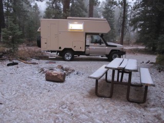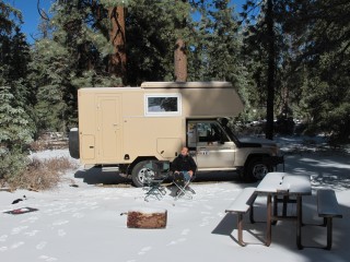 Nach unserer ersten Übernachtung brechen wir auf zu unserem Ziel zum über 2.500 m hoch gelegenen Parque Nacional Sierra de San Pedro Mártir. Oben angekommen, finden wir gleich einen herrlichen Stellplatz inmitten im Wald. Sofort brechen wir zu einer kleinen Wanderung auf. Es ist sehr frisch draussen, ein Blick auf das Thermometer zeigt 1°C. Puh, das wird eine kalte Nacht. Wir kramen unser Winterbettzeug aus der Sitztruhe. Plötzlich fängt es an zu regnen - EISREGEN - auf der Baja California? Ungläubig schauen wir uns an. Damit haben wir nun gar nicht gerechnet. Kurz drauf fängt es auch noch an zu schneien und nicht nur das, ein wahrer Schneesturm tobt die ganze Nacht!