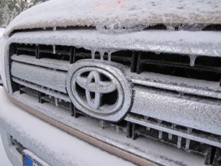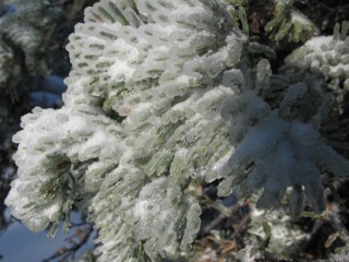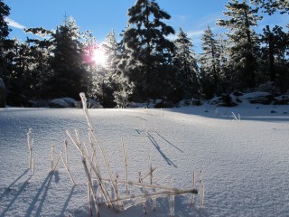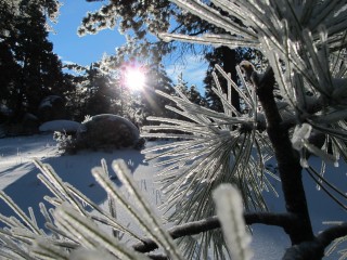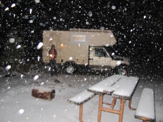 Nach einer bitterkalten Nacht kriechen wir am Morgen aus den Federn, draussen erwartet uns ein Wintermärchen. Alles ist verschneit, jede einzelne Nadel an den Nadelbäumen ist dick vereist. Die Sonne lässt den Schnee glitzern. Begeistert ziehen wir los und genießen diese Winterlandschaft. An eine Weiterfahrt ist heute eh nicht zu denken, unter dem Schnee ist die Straße spiegelglatt.