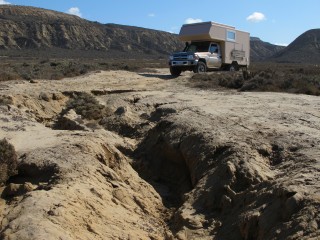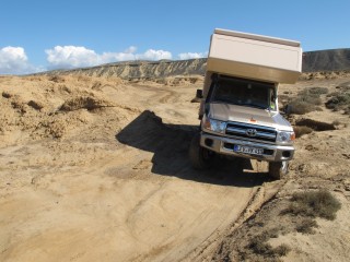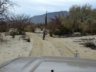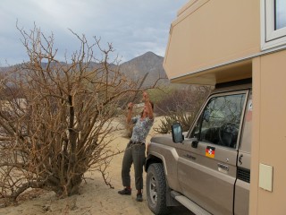 Wenn der Übermut zu groß wird, biegen wir von diesen Pisten auf noch schlechtere sandige Pisten ab, die zur Baja 500, 1000 oder Bahía 200 Rallye gehören. Diese Strecken, extra für diese Rallyes angelegt, sind jedoch für wesentlich kleinere Autos gedacht. Irgendwann ist ein Umkehren für uns aber nicht mehr möglich, so holen wir kurzerhand unsere Machete raus, um die unangenehm dornigen Äste abzuschlagen, die beim Vorbeifahren so kratzende Geräusche an unserer Kabinenwand verursachen.