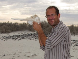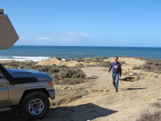 Als sich der Expedi im lockeren Sand quer stellt und nur noch schiebt, wird auch noch die Schaufel zur Hand genommen, um die völlig ausgefahrene Spur zuzuschaufeln. Als wir am Nachmittag endlich eine einsame romantische Bucht inmitten schneeweißer Dünen entdecken, fährt sich der Expedi im Strand fest. Wir kommen nur mithilfe der Sandbleche frei, nachdem Klaus Luft aus den Reifen lässt und wir die Hinterräder frei schaufeln. Zur Entlohnung tümmeln sich am Abend drei Delfine direkt vor uns im Wasser, während wir viele Delfin-Skelette am menschenleeren Strand finden.