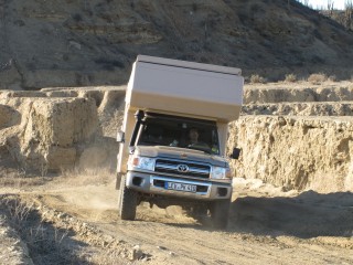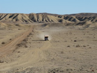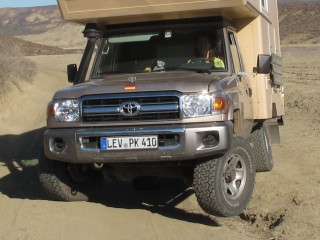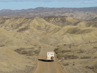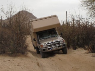 Unbedacht steige ich in den Expedi und fahre los. Klaus steht, den Fotoapparat in der Hand, vor dem Auto. Ich denke, er weist mich an dem riesigen Loch vorbei, er denkt, ich weiss, was ich tue. Kleines Missverständnis mit großen Folgen. Während ich das Lenkrad einschlage und losfahre, steht Klaus mit vor Entsetzen verzerrtem Gesicht hundert Meter vor mir, hat aber noch den Nerv, auf den Auslöser zu drücken, während unser Expedi kurzzeitig auf drei Rädern über das große Loch auf der ausgewaschenen Piste schwebt. Beim offroad fahren - oder Piste fahren - fehlt zwischen uns ganz offensichtlich noch die letzte Feinabstimmung.