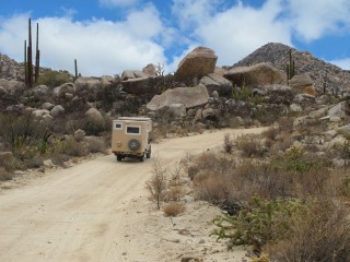 Am nächsten Tag wollen wir uns die sandigen Pisten sparen, bis wir einmal falsch abbiegen. Ups, wieder das gleiche Spiel! Nach einigen Kilometern wird die Strecke so schlecht, dass wir umkehren müssen. Auf dem engen Pfad eine weitere Herausforderung! Nach einer gefühlten Ewigkeit landen wir wieder am Ausgangspunkt. Bis wir bei Los Arcos die Hauptstraße Mex 1 und somit die Baja California Süd erreichen, müssen wir noch kilometerlang über übelste nervtötende Wellblechpiste. Trotzdem - uns wird die Baja Nord als DAS Offroad-Paradies in Erinnerung bleiben!