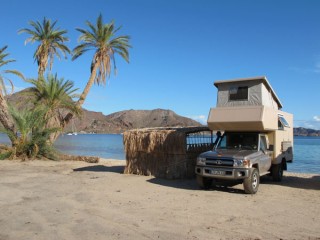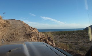 Die nächsten zwei Wochen stehen wir überwiegend an malerischen Stränden, mal ganz einfach von der Mex 1 zu erreichen oder aber abenteuerlustig über anspruchsvolle Pisten abseits der Hauptstraße. Sowie man auf eine Piste abbiegt, erfährt man auch gleich pitoreske Landschaften, die Strecken winden sich durch die schroffe Bergwelt der Baja. Während sich mal links mal rechts die Felswand in die Höhe streckt, fällt es auf der anderen Seite steil in die Tiefe. An den Kurven klammere ich mich an den Griffen im Inneren fest, um allein mit meiner ganzen Willenskraft den Wagen vor dem Abrutschen zu retten. Was natürlich nicht nötig ist, da Klaus uns langsam und sicher durch das Gelände manövriert.