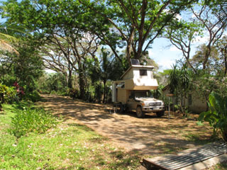 Costa Rica: Playa Sámara, Camping Los Cocos (ATT003_COS) N 9.88134 W 85.52548, 0 m 5.000 Colón/Tag (~ 7,80 Euro) (10 US$/Tag. Wir haben in US$ bezahlt.) Campingplatz direkt am touristischen Strand von Sámara. Schattig unter Palmen. Kalte Duschen, grenzwertige Toiletten. Größere Wohnmobile könnten Schwierigkeiten haben, sich durch die Palmen und die tiefhängenden Stromkabel zu manövrieren. Toller Platz zum Baden im warmen Meer, zum Abhängen und zum Leute beobachten. Etliche Restaurants und Bars direkt nebenan, doch ruhig in der Nacht. |