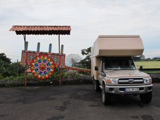 Costa Rica: Nationalpark Volcán Irazu, neben dem Eingangstor (ATT009_COS) N 9.97891 W 83.83533, 3.269 m 0 Colón/Tag (~ 0,00 Euro) Die Zufahrt zum Vulkan ist von 15:30 - 8:00 Uhr verschlossen. Wir sind schräg rechts in den Weg neben dem Kassenhäuschen eingebogen und haben nach 10 m rechts eine wunderschöne, kleine Haltebucht gefunden, in der wir gerade stehen konnten. Toller Sonnenaufgang mit Blick hinunter in das wolkenverhangene Tal. Am späten Abend kamen Wächter aus dem Park vorbei und haben gefragt, ob bei uns alles o.k. wäre. Ab 6:00 Uhr kamen die ersten Parkmitarbeiter zur Arbeit. Eintritt zum Natinalpark: 10 US$/Person plus 3 US$/Fahrzeug. |