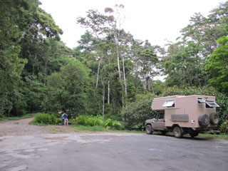 Nicaragua: Selva Negra, Hotel Selva Negra (ATT004_NIC) N 13.00037 W 85.90876, 1.300 m 465 Cordoba/Tag (~ 15,50 Euro) (20 US$, ursprünglich 15 US$/Person, da jedoch über Ostern alles ausgebucht war, bekamen wir eine Ermäßigung) Riesige Kaffeeplantage mit Schwarzwald-Atmosphäre. Eigentlich will man keine Campinggäste, wir durften uns jedoch irgendwo hinstellen (optimal war für uns der Platz direkt am Trailhead). Saubere Toiletten während der Öffnungszeiten des Restaurants. Keine Duschen. Herrlich kühl in der Nacht! Sehr schön angelegte Wanderwege, auf denen man stundenlang durch den tropischen Wald oder die Kaffeeplantage spazieren kann. Restaurant mit Terasse am See. Leckere Bratwürste mit Sauerkraut und Kartoffelpürree (8 US$, es werden auf die Rechnung noch automatisch 25% für Steuer und Trinkgeld aufgeschlagen). Man kann sehr guten Camembert und Manchegokäse kaufen. |
