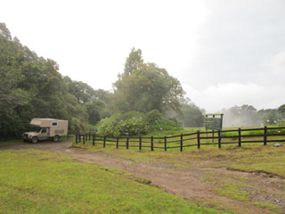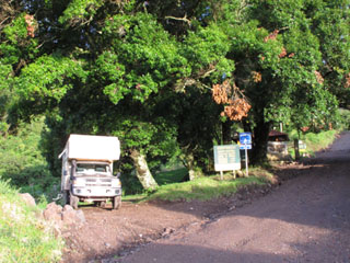 Panama: Nationalpark Vulkan Barú, Osteingang (ATT003_PAN) N 8.79696 W 82.49097, 1.840 m 0 US$/Tag (~ 0,00 Euro) Die letzten zweihundert Meter hinauf zum Eingang des Nationalparks führen über eine sehr schlechte und steile Schotterpiste. Wir durften uns für die Nacht direkt vor dem Eingang links in einen kleinen Fahrweg stellen. Ab sieben Uhr in der Früh wurde es lauter, weil viele Campesinos auf dem Weg zur Arbeit vorbeikamen. |