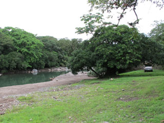 Panama: Caldera, am Ufer des Rio Chiriquí (ATT002_PAN) N 8.65482 W 82.34170, 291 m 0 US$/Tag (~ 0,00 Euro) Die Thermalquellen von Caldera waren unser Ziel, doch die letzten 500 Meter waren unpassierbar (zu hohe Felsstufen für unser Auto). Der Weg zu alternativen Quellen rechts scheiterte am tiefen Lehm. Wir haben die Nacht sehr ruhig und idyllisch am Ufer des Rio Chiriquí verbracht. |