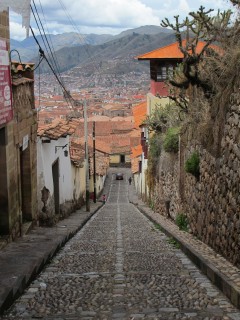 Eine falsch erwischte Strecke durch winzige Dörfer, über 100 Kilometer lange Bauarbeiten mit immer wieder gesperrten Baustellen und am nächsten Morgen eine fünfstündige Straßenblockade durch aufgebrachte junge Demonstranten verhindern, dass wir die landschaftlich schöne Strecke trotz Überquerung einiger 4.000er Pässe auch nur annhähernd genießen können. Als wir dann auch noch auf einen "Camino de la Muerte" - Straße des Todes - kommen, liegen die Nerven blank. Die relativ gute Piste schlängelt sich kurvenreich aufwärts, gleich neben der Strecke stürzt es steil in die Tiefe, hier und dort sind die Ränder abgebrochen. Auf der uneinsehbaren einspurigen Strecke rasen die Peruaner, was das Zeug hält. Eine Vollbremsung folgt der nächsten und einmal entgehen wir nur um Milimeter einem Zusammenstoß. Spät am Abend kommen wir endlich in Cusco an, verfahren uns natürlich auf dem Weg zum Campingplatz und landen in den schmalen steilen Gassen der historischen Altstadt. Selbst Klaus zeigt Nerven und schreit sein Navi an, das mal wieder bevorzugt die engsten Gassen vorschlägt.