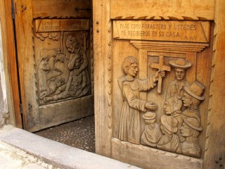 Kunstvoll geschnitzte Holztür an der