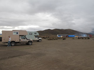 Aber wir haben es eilig. Swantje und Stefan erwarten uns am Salar de Uyuni. Unterwegs bleiben wir jedoch an einer Straßenblockade hängen - für 19 Stunden!! Die Demonstranten haben die Straße mit großen Sandhügeln abgesperrt. Zwar könnte man ggf. über einen kleinen Umweg daran vorbei fahren, aber die Gefahr, als Streikbrecher mit Steinen beworfen zu werden, ist uns zu groß. Unseren geplanten Übernachtungsplatz an der warmen Lagune Ojo de Inca können wir vergessen. Stattdessen verbringen wir die Nacht neben der Straße auf einem freien Feld. Um sieben Uhr am frühen Morgen wird die Blockade kurz geöffnet. Sofort reihen wir uns in den riesigen Stau, damit wir noch durchkommen. Wir haben Glück, noch während wir die Strecke passieren, wird schon wieder an einer neuen Blockade gearbeitet. Evi, Hans und Björn, die wir in La Paz kennengelernt haben und mit denen wir gemeinsam in der Blockade stehen, sind das letzte Fahrzeug, das noch durchkommt. Ziemlich genervt kommen wir am späten Nachmittag in Uyuni an. Der Ort präsentiert sich uns als einer der hässlichsten Orte, die wir auf unserer langen Reise angefahren haben. Aber egal, was für eine Freude, als wir Swantje und Stefan wiedertreffen.
