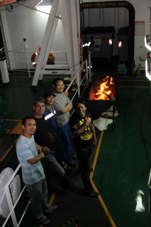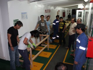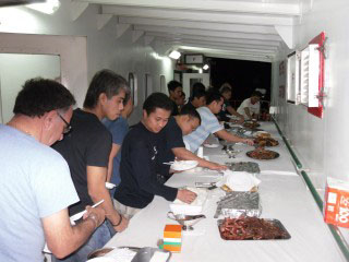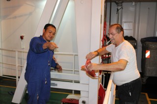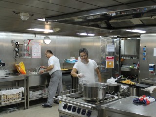 ist für die Mannschaft ziemlich langweilig. Es gibt den Kapitän, der die unangefochtene Autorität besitzt und das internationale Seerecht gibt ihm uneingeschränkte Macht. Sicherlich notwendig, um einen reibungslosen Ablauf zu gewährleisten. Auf unserem Schiff befinden sich zehn Offiziere, zur Hälfte Italiener, zur anderen Hälfte Philipinos. Der Koch ist natürlich - neben dem Kapitän - die wichtigste Person an Bord. Mit einem leckeren und guten Essen im Magen lebt es sich nun einmal einfacher. Der Rest der Besatzung, bei uns vierzehn Personen, besteht aus Philipinos. Die "Amtssprache" ist englisch.