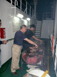 Es geht zurück nach Deutschland. Völlig entspannt gestaltet sich das Einschiffen in Montevideo auf das Frachtschiff Grande Costa D'Avorio, das uns und unseren Expedi nach Hause bringt. Für die nächsten drei Wochen ist es unser Zuhause. Der Tagesablauf für uns pendelt sich sehr schnell ein. Unsere einzige Aufgabe an Bord besteht darin, stets pünktlich in der Offiziersmesse zum Essen zu erscheinen. Unser italienischer Koch gibt alles und so schlemmen wir mittags und abends mindestens ein drei Gänge Menu. Täglich Pasta in abwechselnder Zubereitung als Antipasti, zweimal täglich Fleisch, wechselnde Beilagen, gelegentlich Fisch und als Dessert gibt es Obst und Kaffee. Hin und wieder wird für die komplette Mannschaft ein Barbeque veranstaltet. Tja, auch hier bleiben wir also unserem Motto treu: Schlecht gehen, wird es uns noch früh genug, hier aber definitiv nicht!