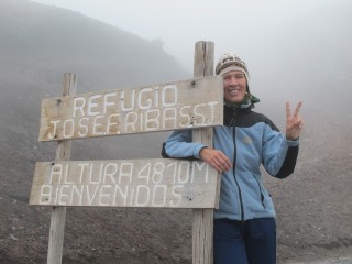 Drei Nächte verbringen wir auf über 3.800 Meter Höhe, unser zweiter Anlauf, das Refugio zu besteigen, gelingt. Bei herrlichem Sonnenschein wandern wir los, doch schnell werden wir von den dichten Wolken eingeholt. Meter um Meter nähern wir uns dem Ziel. Es liegt zwar nur 200 Höhenmeter vom Parkplatz entfernt, doch bei dieser Höhe wird die Luft bei jedem Schritt dünner und dünner. Stolz posiere ich etwas kurzatmig neben dem Schild am Refugio: wir befinden uns auf 4.810 Meter!