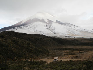 Leider liegt der mit 5.897 Metern zweithöchste Vulkan des Landes in dichten Wolken, trotzdem versuchen wir unser Glück. Unser Expedi erkämpft sich Meter um Meter seinen neuen Höhenrekord, bis wir auf über 4.600 Meter den letzten Parkplatz vor dem Aufstieg erreichen. Unser Ziel ist das Refugio, doch der stürmische Wind bläst uns Graupelschauer waagerecht ins Gesicht, so dass wir nach zwei vergeblichen Anläufen patschnass den Weg nach unten suchen.