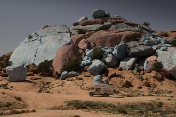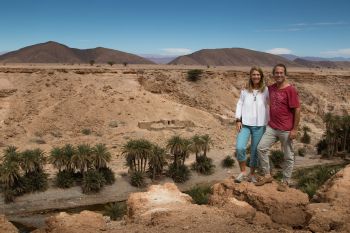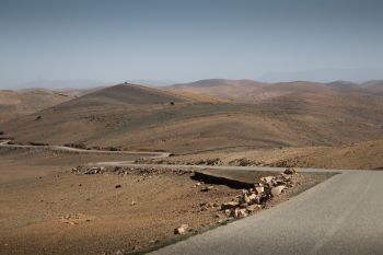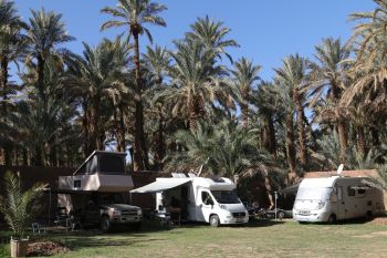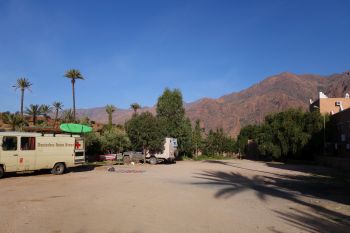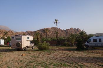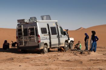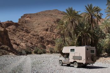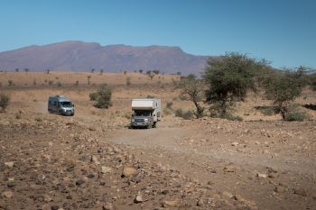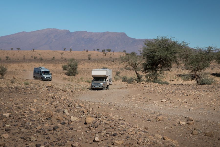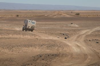 Wer an Wüsten denkt, hat die golden wogenden Sanddünen der Sahara vor Augen. Doch die Realität sieht anders aus. Eine unwirtliche Steinwüste erwartet uns, als wir in Foum Zguid vom Asphalt auf die kleine Piste abbiegen, die uns auf den nächsten 135 Kilometern über das Erg Chegaga nach M'hamid bringen wird. Hart wie Beton haben sich kleine, gemeine Wellen in die Piste gegraben und machen die Fahrt zur Tortur. Jede Umdrehung der Reifen wird von einem harten Schlag begleitet, der nicht nur bis in unsere Wirbelsäule durchschlägt, sondern auch unseren Expedi bis in die letzte Schraube erzittern lässt. Ständig bange ich um unseren Außenspiegel, der so stark zittert, dass ich verzweifelt den Arm aus dem Fenster strecke, um ihn am Abbrechen zu hindern.
