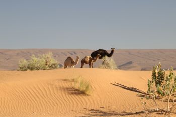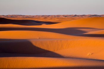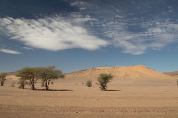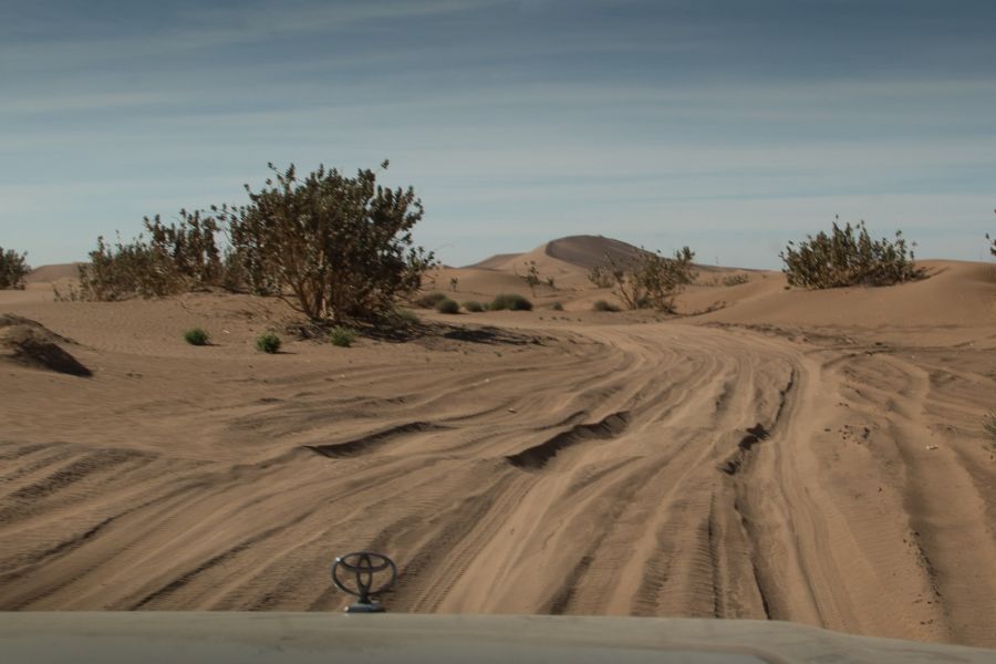 Während wir mit knapp 20 km/h langsam gegen Osten holpern und uns die Frage stellen, warum wir uns solch schlechte Pisten immer wieder antun, öffnet sich vor uns eine endlose Fläche: Wir haben den Lac Iriqui erreicht, ein riesiger, ausgetrockneter See. Am Horizont flimmert die Luft und zaubert die Fata Morgana eines weiteren, riesigen Sees vor unsere Augen. Dazwischen ragen einzelne kleine Hügel hervor, die sich beim Näherkommen als die ersehnten Sanddünen herausbilden.