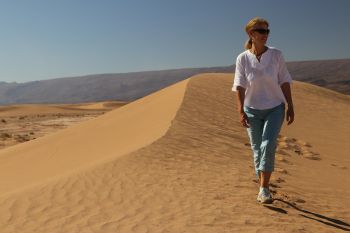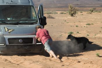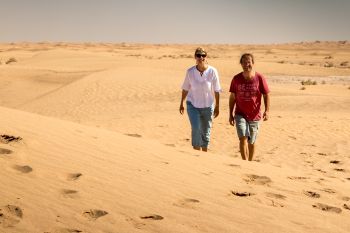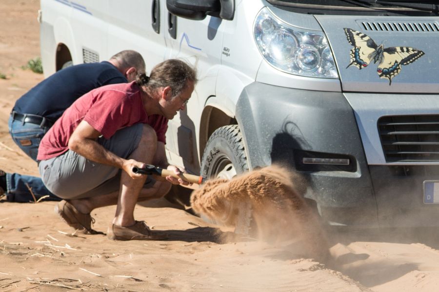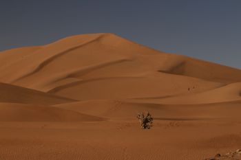 Und dann ist sie endlich da: die Sandwüste der Sahara. Eigentlich kein Sand, sondern ein feiner Staub, der uns bis über die Knöchel versinken lässt, als wir die erste Düne erklimmen. Wie berauschend ist die Fahrt mit dem Auto durch diesen tiefen, weichen Sand. Unser Wagen fährt nicht mehr, sondern schwimmt regelrecht, wird trotz aller Lenkbemühungen wie auf unsichtbaren Schienen immer wieder nach links oder rechts fortgerissen. Als säßen wir in einer Achterbahn, in der wir zwar gerne die Kontrolle hätten, aber immer wieder von Richtungswechseln überrascht werden.