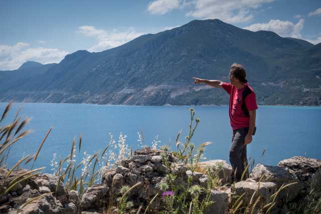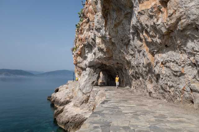 Auf der Fahrt Richtung Süden finden wir an der Straße einen Abzweig zum Kloster Avgo und beschließen spontan, ein weiteres Mal die Festigkeit meiner Wandersohle zu testen und wandern hinauf. Vor hunderten von Jahren wurden viele Klöster Griechenlands in einsamer Umgebung hoch oben in den Fels hineingebaut, so auch dieses aus dem 11. Jahrhundert. Wir haben Glück und treffen auf einen von nur zwei Mönchen, die dort oben leben und erfahren viel über seine Geschichte.