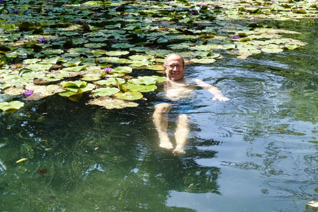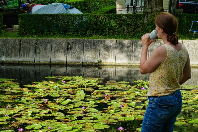 Ich liege im 30°C warmen Wasser und lasse mich völlig entspannt in die Seerosen treiben. Wohlig paddel ich ein bisschen weiter, bis ich im Schatten des tiefhängenden Astes der riesigen Eiche bin, die herrschaftlich am Rande steht. Das Wasser kommt direkt aus dem Thermalsee in Héviz, das von dort über den kleinen Kanal Richtung Balaton fließt. Und wir stehen mit unserem Expedi direkt am Ufer dieses kleinen Flußlaufes auf einem wunderschönen Campingplatz. Ja, so gemütlich kann unsere Abenteuertour Balkan starten. Wir sind vom Glück verwöhnt! Als uns am letzten Tag eine Wasserschlange entgegenschwimmt, beschließen wir jedoch, unseren Wellnessurlaub zu beenden.