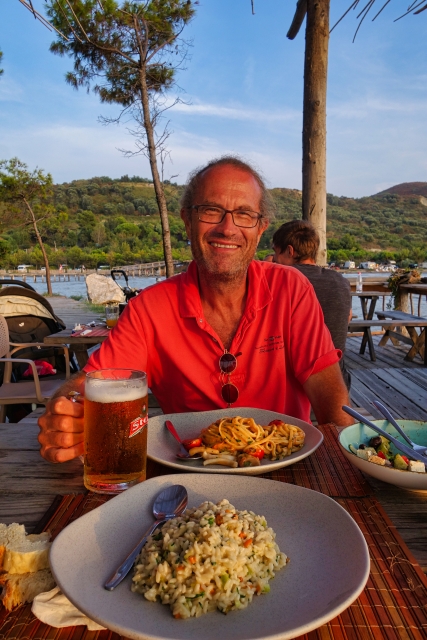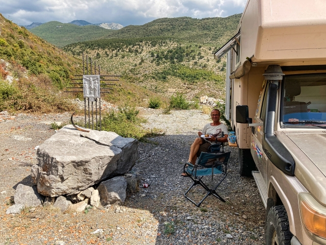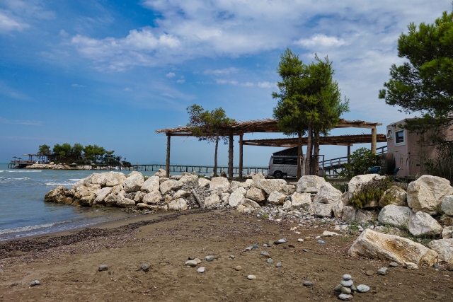 Der Stellplatz liegt direkt vor den tosenden Wellen der Adria, bzw. hier ist es noch das Ionische Meer, das bei Albanien in die Adria übergeht. Wir befinden uns an der albanischen Rivieraküste und kurz nach Abstellen unseres Expedis stürzen wir uns bereits ausgelassen in die überaus warmen Fluten. Wir haben den südlichsten Punkt der Balkantour erreicht, ab nun geht es langsam wieder Richtung Norden.