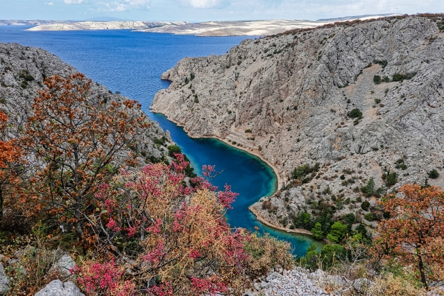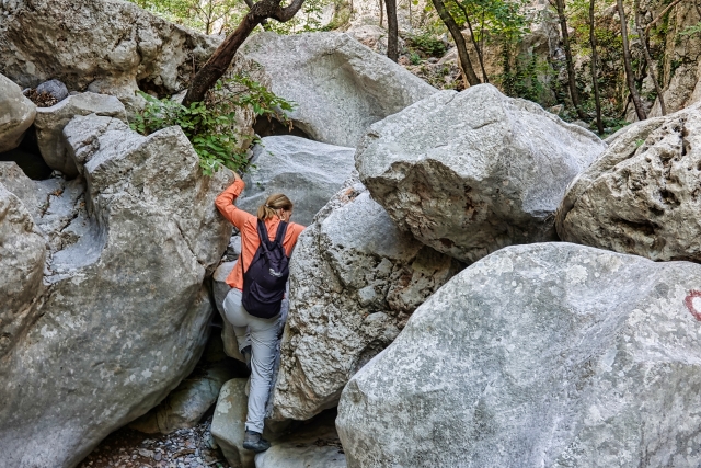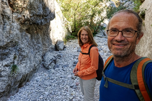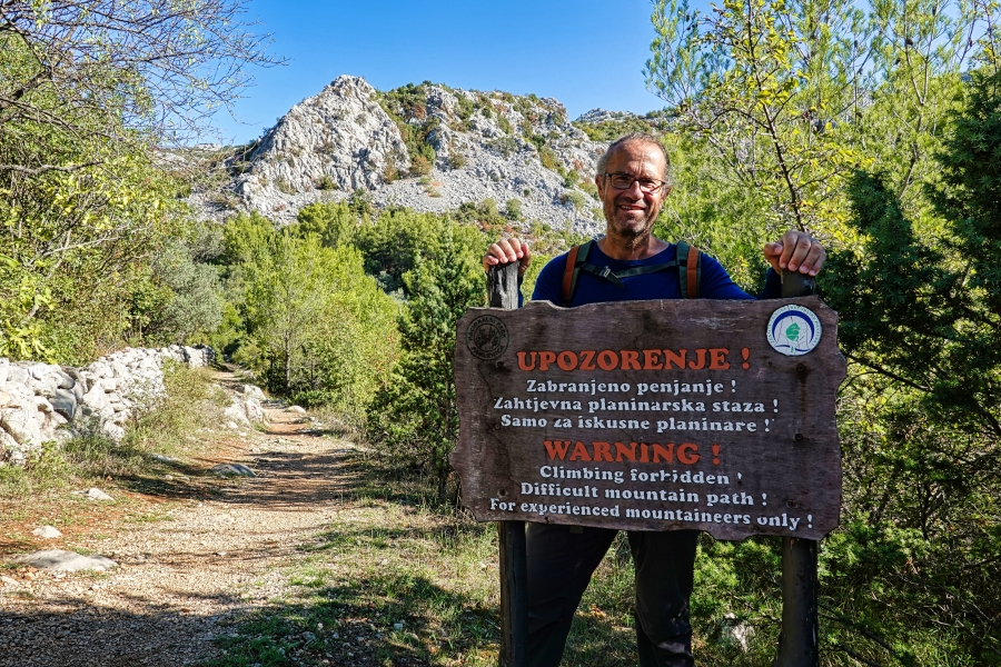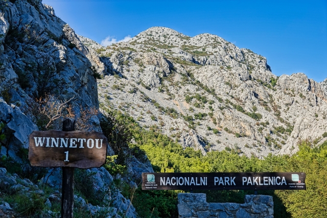 Am Abend sitzen wir gemütlich auf unserem Sofa im Expedi und stimmen uns stilgerecht auf die morgige Wanderung ein - Winnetou und Old Shatterhand im Tal der Toten. Dieser Film wurde u. a. im Nationalpark Paklenica gedreht, den wir am nächsten Morgen bezwingen wollen. Also Wanderschuhe geschnürt und los geht es, allerdings nicht hoch zu Pferd, sondern schweißtreibend zu Fuß. Die kargen Felswände wachsen im Nationalpark vor uns in den Himmel, die Bergwelt ist beeindruckend und wild. Das Hinweisschild am Eingang ignorieren wir geflissentlich, auf dem vor dieser Strecke gewarnt wird: Achtung, nur für erfahrene Wanderer! Nun, sind wir das etwa nicht!! Noch lachen wir und witzeln darüber! Hin geht es über die Schlucht Mala Paklenica, die kleine Schlucht. Von klein kann hier allerdings nicht die Rede sein. Stundenlang klettern wir über mannshohe Felsbrocken, die im ausgetrockneten Flussbett liegen. Die Filmmusik, die ich anfangs noch fröhlich vor mich hin summe, ist längst verstummt. "Wie konnten die Apachen mit ihren Mokassins dort nur so elegant und behend herumspringen?", frage ich mich immer wieder, während ich mich mühsam und ächzend über die Steine wälze.