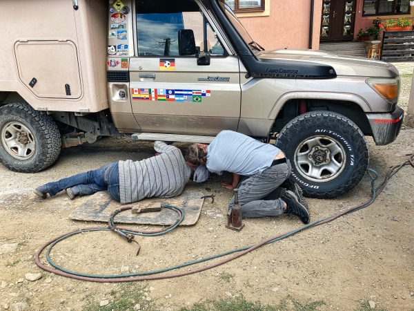 Als wir übermütig über eine Schotterpiste rumpeln, reißen wir uns leider die Auspuffaufhängung ab. Seit unserer letzten Tour durch die Mongolei ist dies unsere Achillesferse. Die nette Besitzerin am Campingplatz ruft einen Bekannten an, der vorbeikommt und sich den Schaden anschaut. Er kann es nicht repararieren, aber sein Bekannter kann es. Also wird erneut telefoniert und letztendlich wird der Auspuff mal eben schnell geschweißt - wir zahlen 10 Euro und die ganze Angelegenheit hat nur 45 Minuten gedauert.