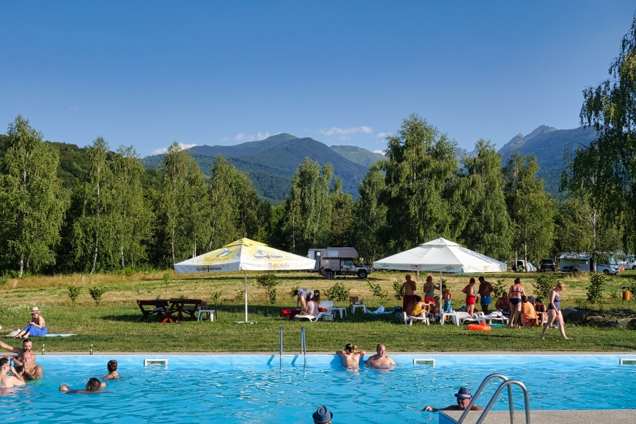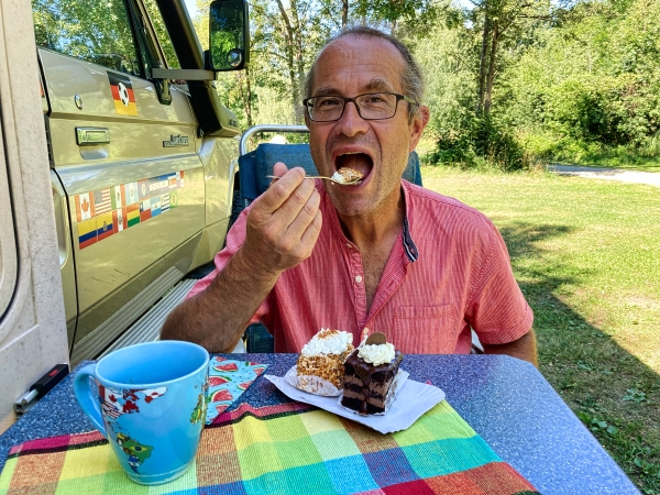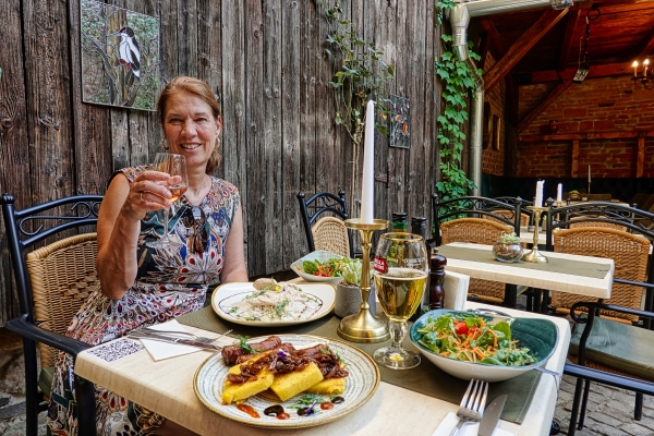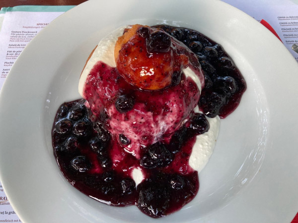 Seit wir in Rumänien eingereist sind, gehen wir häufig essen. Das liegt nicht nur am günstigen Preis in den Restaurants, sondern vor allem an der guten Qualität. Es schmeckt uns vorzüglich. Da die Hitze uns wieder einholt und auslaugt, lechzen wir nach Abkühlung. Als wir am Albota Complex Turistic auf den Campingplatz rollen, springen wir sofort in den kühlen Pool. Und am Abend genießen wir mal wieder frische Forellen aus der eigenen Forellenzucht vor Ort und zum Dessert die landestypische Spezialität, Papanasi - Quarkbällchen. Ja, es könnte uns schlechter gehen ...