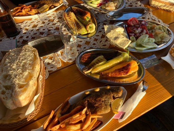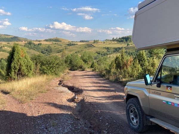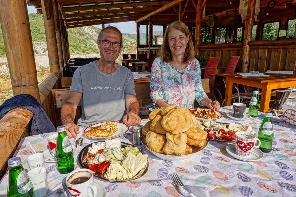 Und dann passiert einer dieser Zufälle, die die Abenteuertour so einzigartig machen. Wir verfahren uns auf dem Weg zu einem Übernachtungsplatz am Uvac Canyon. Es ist bereits später Nachmittag und wir beschließen, wenigstens den Aussichtpunkt noch zu erreichen. Doch im Pistendurcheinander verfahren wir uns erneut, das Wenden auf den schmalen Strecken fällt schwer. Wir sind genervt, es war obendrein ein langer Fahrtag heute. Klaus findet in seinem Navi einen schmalen Pfad, den wir langsam entlang rumpeln, der Expedi schaukelt auf der Piste hin und her, bis der Weg plötzlich endet. Doch da steht Slavica, lacht uns an und weist uns direkt neben ihr Restaurant oberhalb des Canyons und bedeutet uns, dass wir hier stehen können. Wir verstehen kein Wort, Slavica spricht weder deutsch noch englisch, wir kein serbisch, aber das hindert sie nicht, ununterbrochen zu reden. Trotzdem klappt die Verständigung erstaunlich gut. Dann biegt auch noch ein Landy mit David und Anna aus Deutschland um die Ecke und wir vier werden die nächsten zwei Tage verpflegt und regelrecht gemästet. Slavica freut sich und lacht und redet. Erst später entdecke ich, dass Slavica "die Gefeierte" bedeutet. Und wie wahr, wir feiern sie noch Tage später ob ihrer so netten Art.