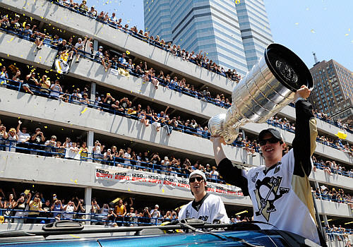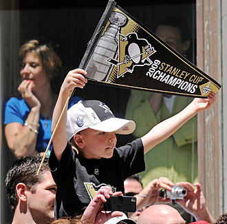 Petra, 13. Juni 2009: In Pittsburgh ist die Hölle los !! Pittsburgh - City of Champions !! Was Vize-, Neverkusen leider nie schafft, hier wurde es in diesem Jahr Wirklichkeit! Nachdem im American Football im Februar die Steelers zum sechsten Mal den Super-Bowl nach Pittsburgh holten (vergleichbar mit dem Gewinn einer WM im Fußball), schafften es jetzt die Pittsburgh Penguins im Eishockey mit dem Gewinn des Stanley-Cups, Pittsburgh in den vollkommenen schwarz-goldenen Siegesrausch zu versetzen. Alle Proficlubs der Stadt tragen die Farben Schwarz und Gold, sie sind es, die Pittsburgh seine Identität verleihen. Ganz nebenbei schafften die Penguins auch etwas, das seit 1975 erst viermal vorkam: Zwei der Titel aus den vier großen US-Sport-Ligen in einer Saison in eine Stadt zu holen! Von den viermal war es sogar bereits einmal Pittsburgh in 1979 (Steelers und Pirates/MLB). Einen interessanten Artikel gibt es dazu auch unter http://www.spiegel.de/sport/ussports/0,1518,630251,00.html . |