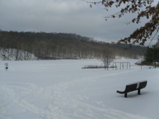 Im Sommer waren wir hier noch zum baden und grillen, nun ist er komplett zugefroren: der See im Racoon Creek State Park.