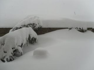Die Lebensbäume sind unter den Schneemassen zusammengebrochen. Die Holzwand ist kaum noch zu sehen.