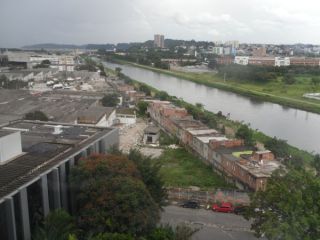 Auf der anderen Seite auf eine illegale Ansiedlung von Wohnhäusern auf dem Bayer Gelände.