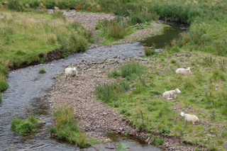 Entlang des River Alwin im Northumberland National Park Der moorig braune River Alwin und die rot lehmige Forststraße schlängeln sich nebeneinander durch das grüne Tal, an dessen mit dichtem Gras und Farn bewachsenen Hängen die Schafe genüsslich weiden.