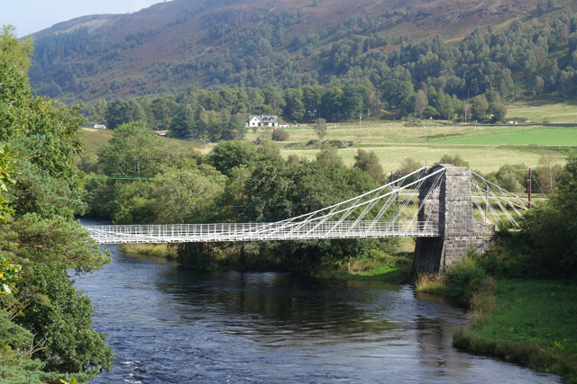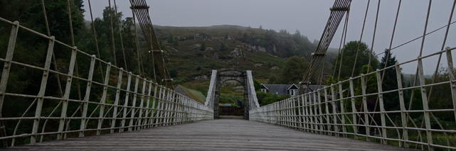 Bridge of Oich (Parkplatz: N 57.093070° W 4.744249°). Mehr Infos hier. Die von James Dredge 1854 entworfene Eisenbrücke unterscheidet sich von anderen Kettenbrücken, weil ihre Kettenglieder dünner ausgebildet sind (siehe Wanderung 27).