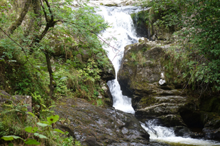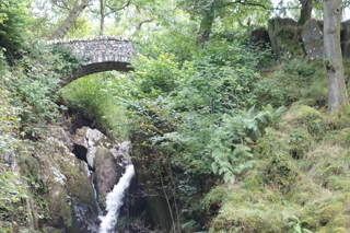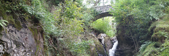 Aira Force (Parkplatz: N 54.57584° W 2.93383°). Mehr Infos hier. Eine Steinbrücke überquert den kleinen Fluss genau am oberen Ende des Wasserfalls, kurz darauf stürzt er 20 m tief in den Ullswater See (siehe Wanderung 29).