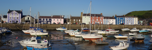 Aberaeron (Parkplatz: N 52.242660° W 4.265306°). Mehr Infos hier. Der Hafen der kleinen Küstenstadt ist nahezu vollständig von farbigen Häusern im Regency-Stil umgeben (siehe Wanderung 38).