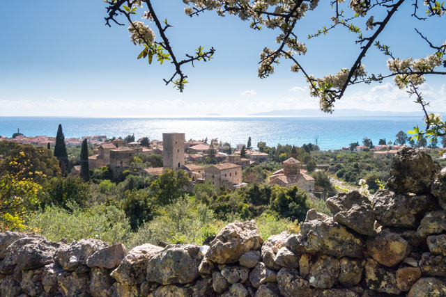 Das aufwendig renovierte Freilichtmuseum der "Alten Stadt Kardamyli" besteht aus einer befestigten Wohnanlage des Troupakis-Mourtzinoi Clans vom Ende des 17. Jahrhunderts. Es zeigt ein typisches Wohnbeispiel in dem von Familienfehden und Blutrache bestimmten Leben innerhalb der Mani Region. Den Kirchturm von Agios Spiridon schmücken vielfältige Ornamente. Weitere Informationen zur Blutrache in der Mani gibt es hier im Internet. In der Nähe befinden sich das Grab des Dioskouroi aus dem 2. oder 3. Jhd. v. Chr. und das Kirchlein Agia Sofia (siehe Wanderung 13).