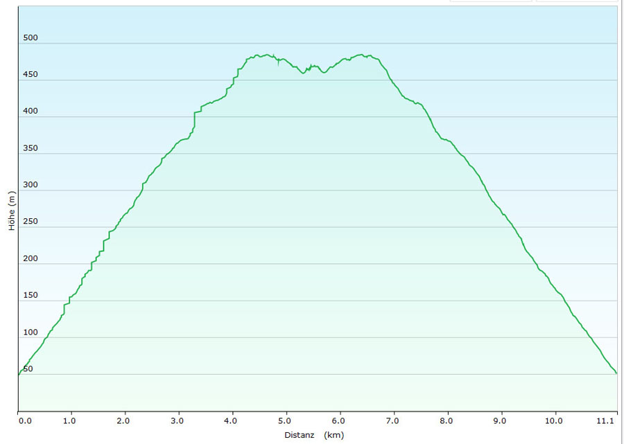 11,1 km, ca. 2:30 h, 469 m Anstieg, Hin- und Rückweg