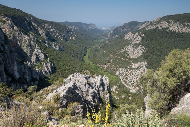 Die Wanderung beginnt im grünen Tal der Rados-Schlucht, wo sie nach Überquerung eines Bergbaches schnell an Höhe gewinnt. Dichte Nadel- und Laubbäume spenden Schatten, die kargen Felswände ragen steil in den Himmel. Das Hinweisschild weist die letzten Meter zur Klosteranlage. Kurz vor Erreichen des Tagesziels wird der Wanderfreund für alle Strapazen mehr als belohnt. Die Aussicht ist überwältigend, der Blick schweift über das eben durchwandernde Tal bis zum weit entfernten Golf von Tolo. Kurz darauf ist es erreicht, das im Berg erbaute Kloster verschmilzt mit dem nackten rauen Felsen zu einer Einheit. Das Gebäude kann auf eigene Faust besichtigt werden. Wer Glück hat, trifft auf einen der dort lebenden Mönche, der Interessantes über diesen Ort zu berichten weiß.